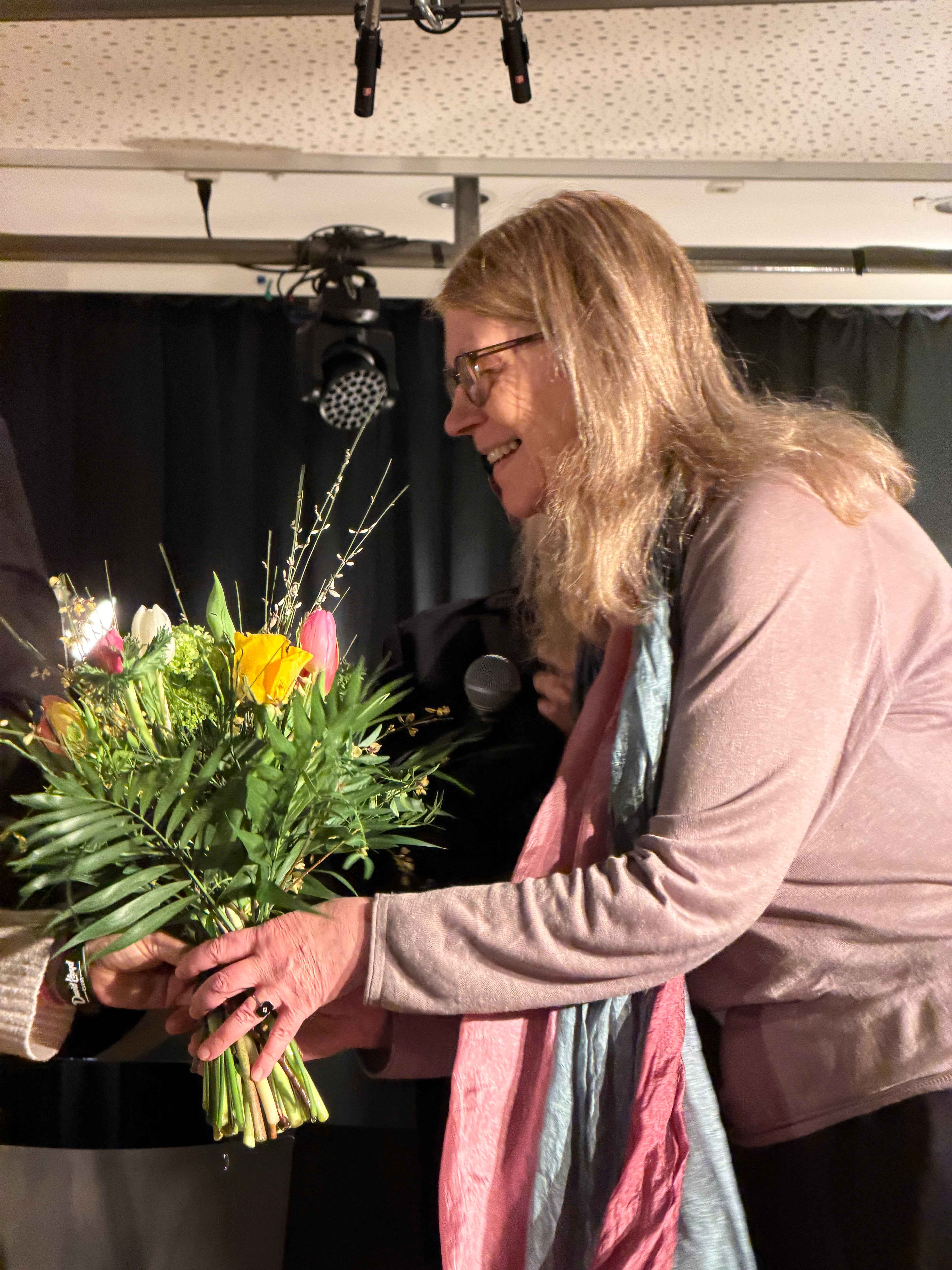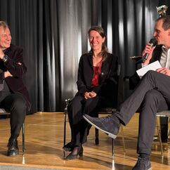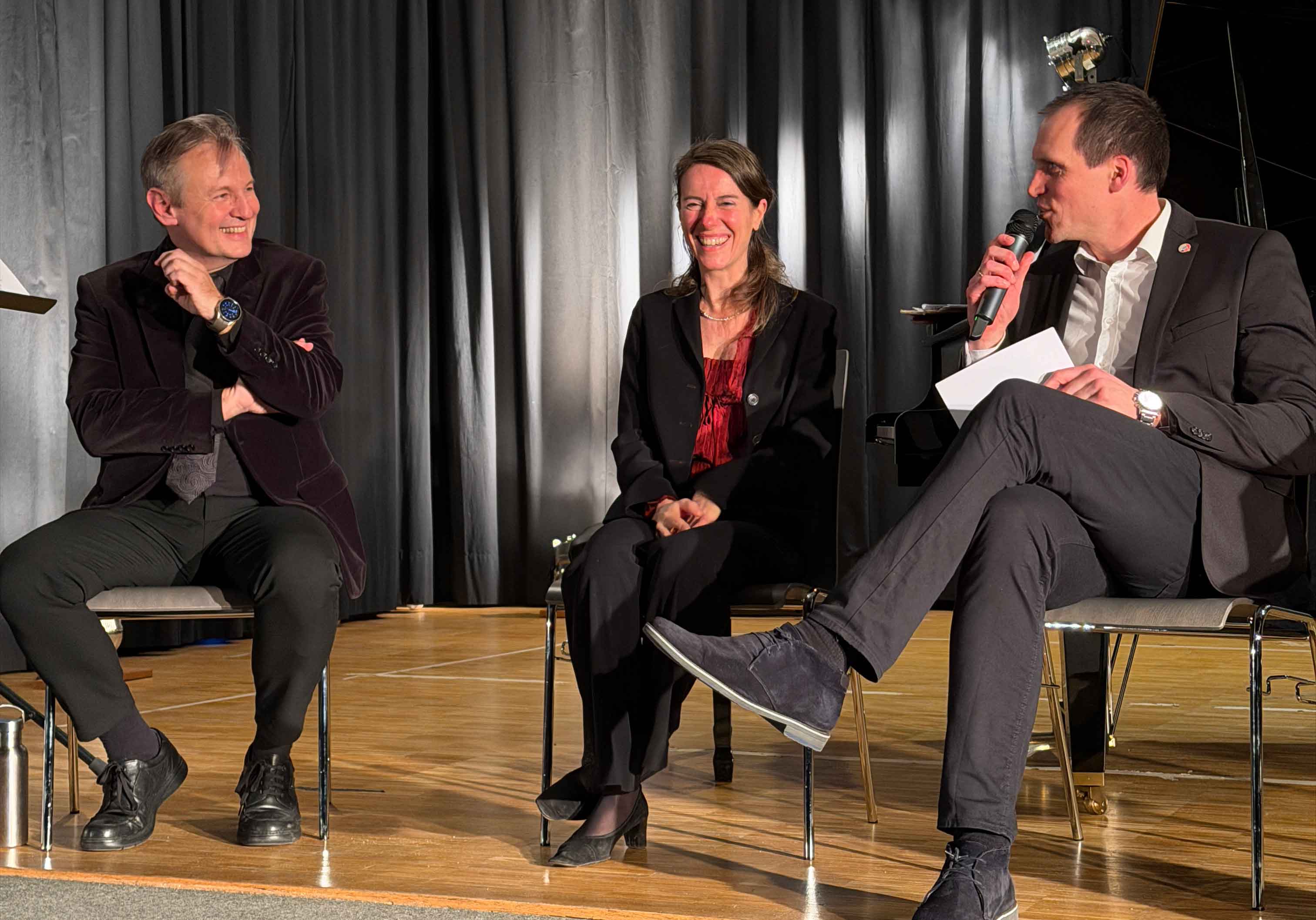Im Publikum saßen SchülerInnen von der 7. Klasse bis zur Oberstufe sowie Menschen aus der Nachbarschaft. Unsere beiden Schülermoderatoren Ben und Sami leiteten zusammen mit Herrn Semerak ein anschließendes Publikumsgespräch. Dies bot nicht nur die Gelegenheit, mit den beiden KünsterInnen ins Gespräch zu kommen. Es entstand außerdem ein generationenübergreifender Austausch über Gedanken und Gefühle zum Thema und es wurde über die Bedeutung des Erinnerns sowie über Demokratiebildung in Schule und Gesellschaft reflektiert.