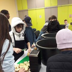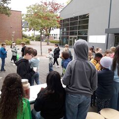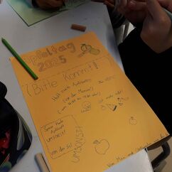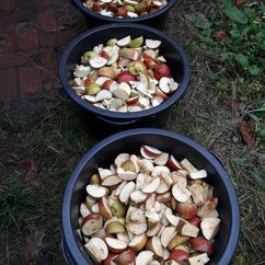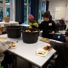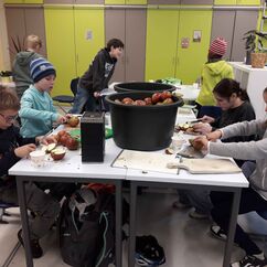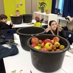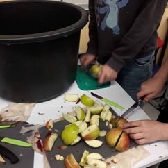Am Apfeltag hatten wir 240 Kilo Äpfel. Wir haben eine Doppelstunde gebraucht, um die Äpfel zu schneiden. Wie haben die Äpfel gehäckselt und dann auch in die Saftpresse getan. Danach haben wir noch am Ende den Apfelsaft verschenkt. Den Leuten hat der Apfelsaft geschmeckt.