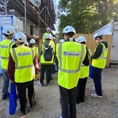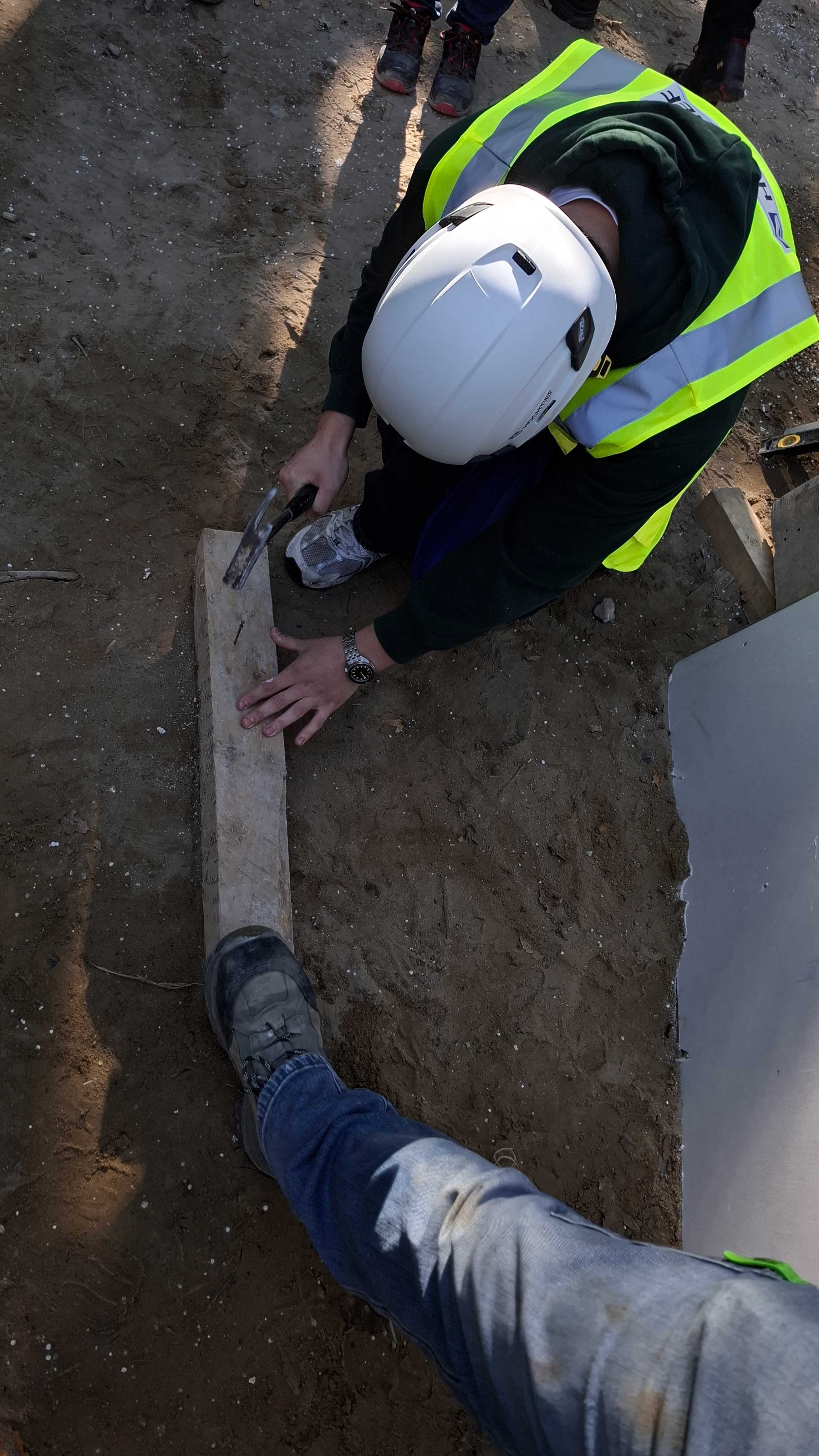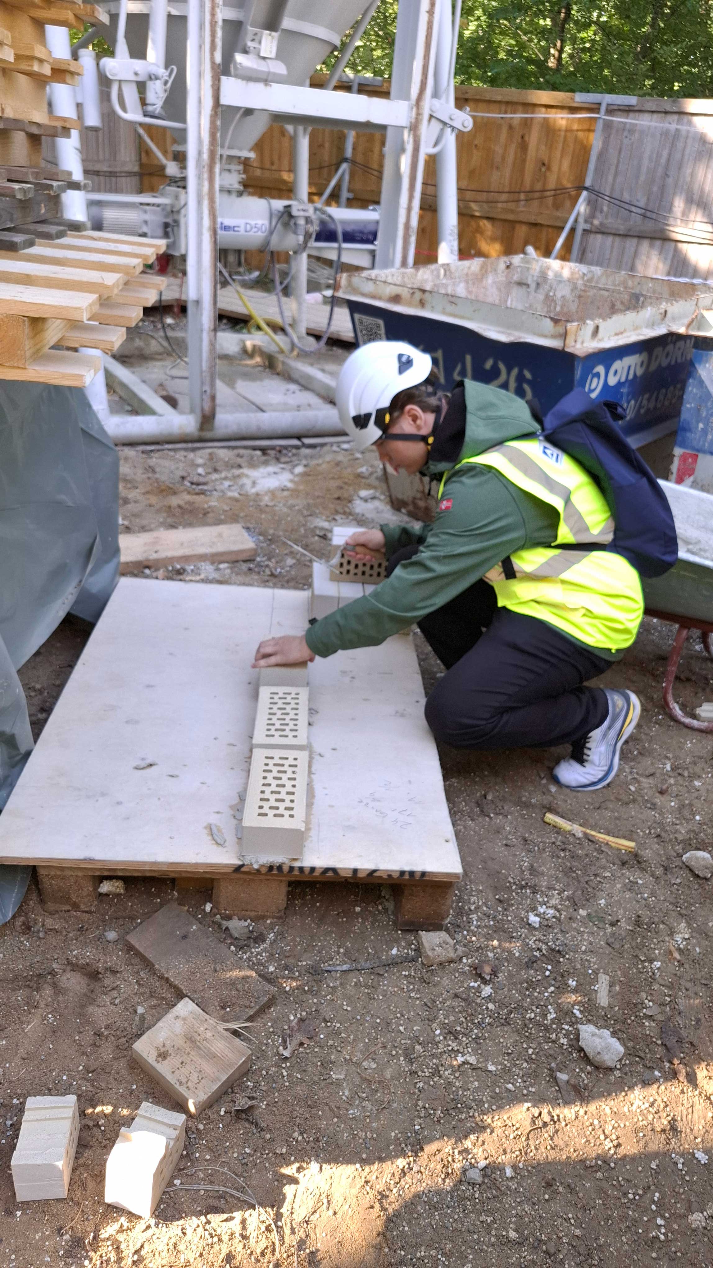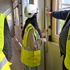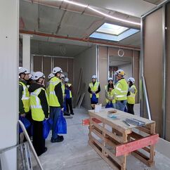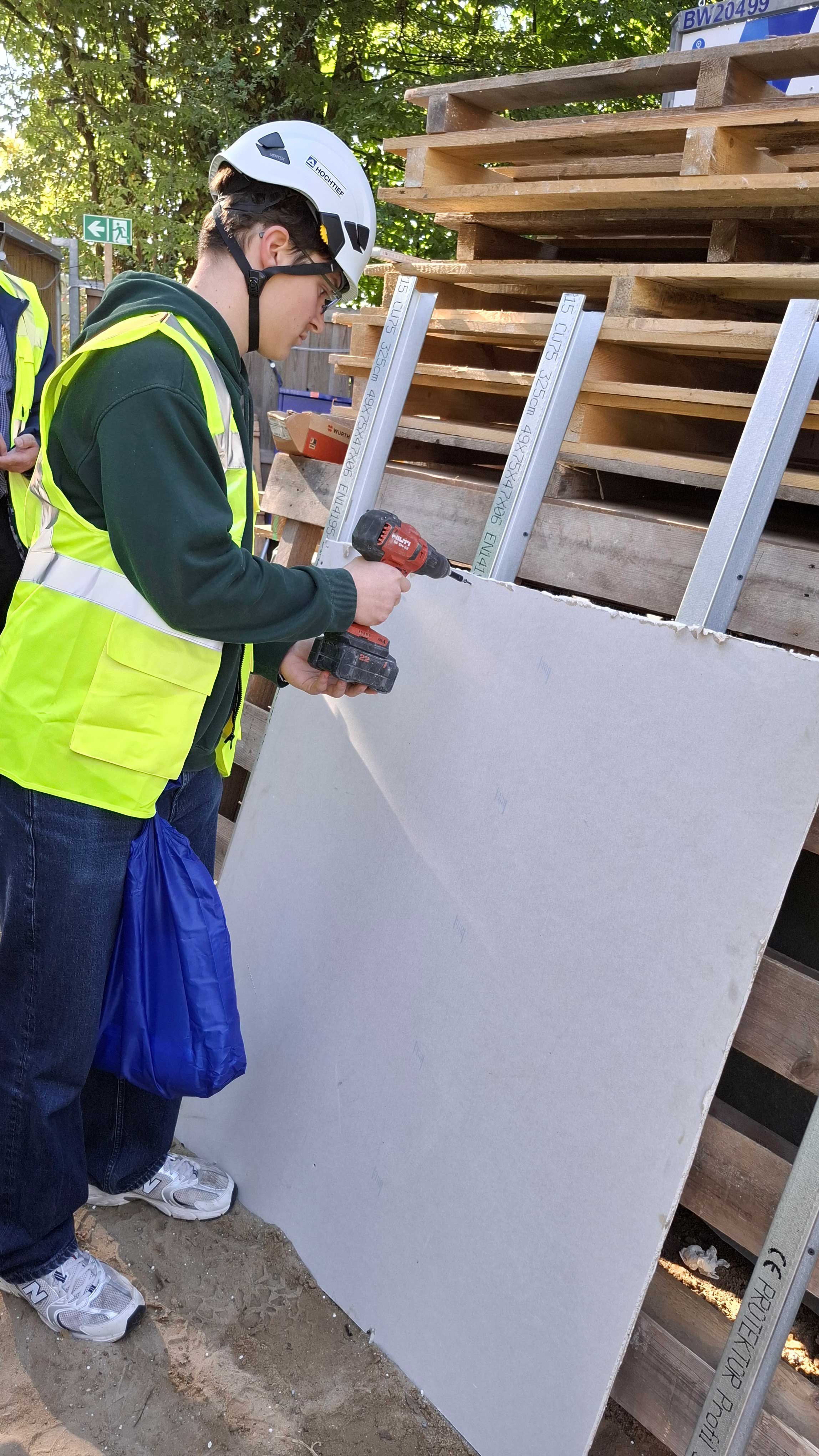 Bevor wir die Baustelle betreten haben, gab es für alle erst einmal einen Schutzhelm und eine gelbe Weste. Zunächst haben wir in einem der Baucontainer Informationen zu den vielen möglichen Berufen auf einer Baustelle erhalten. Anschließend wurde die Gruppe über die gesamte Baustelle geführt. Die Schülerinnen und Schüler konnten sich auch praktisch ausprobieren. Es wurden Nägel in Holz eingeschlagen, Schrauben in eine Trockenbauwand geschraubt und mit dem Einsatz von Mörtel entstand auch eine kleine Ziegelmauer. Zudem gab es einige Interessierte, die anhand des Bauplans einige Wandmaße auf ihre Richtigkeit geprüft haben und mit Hilfe einer Wasserwaage feststellen sollten, ob bestimmte Wände, zum Beispiel am Fahrschulschacht, im Lot sind.