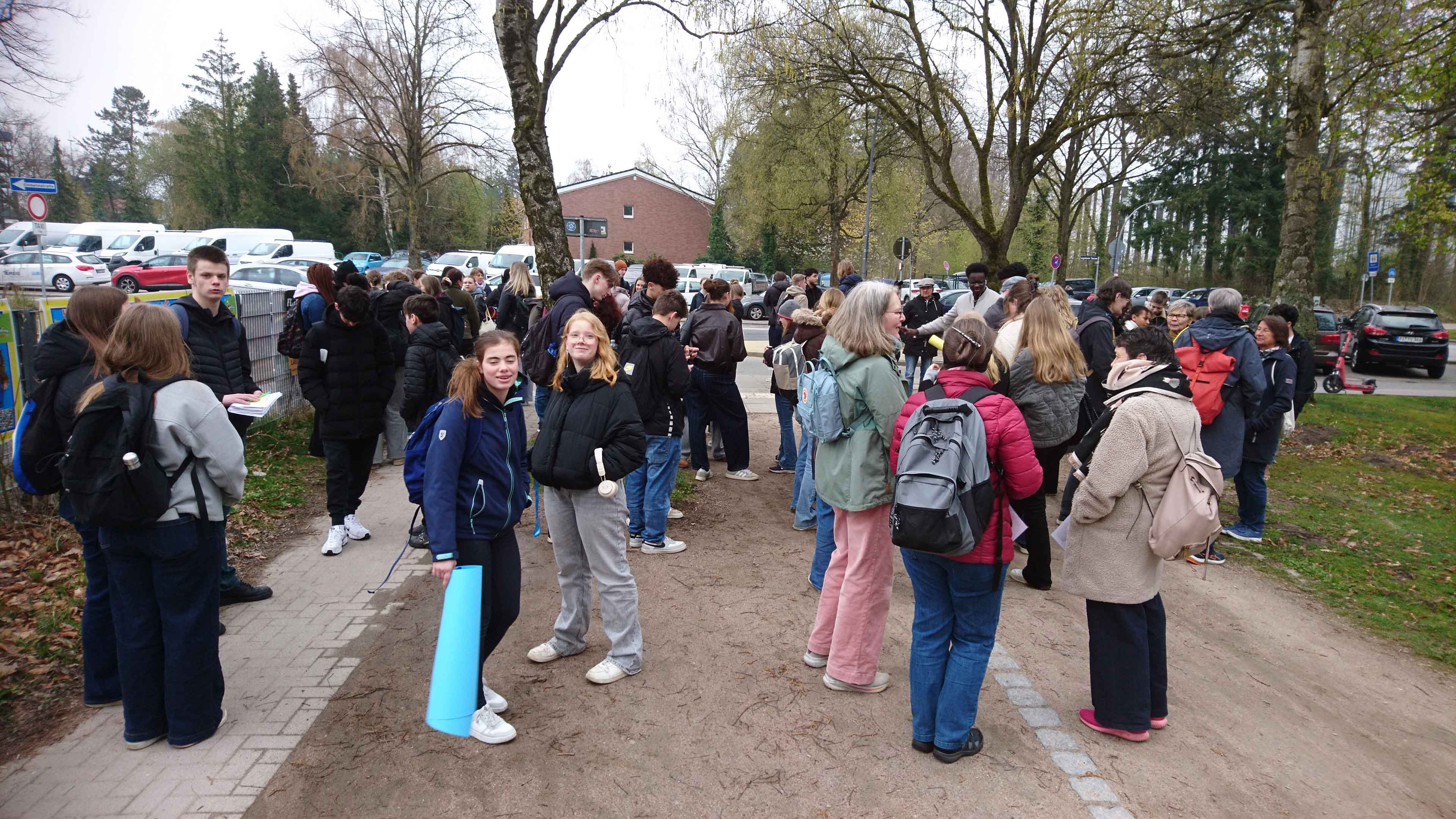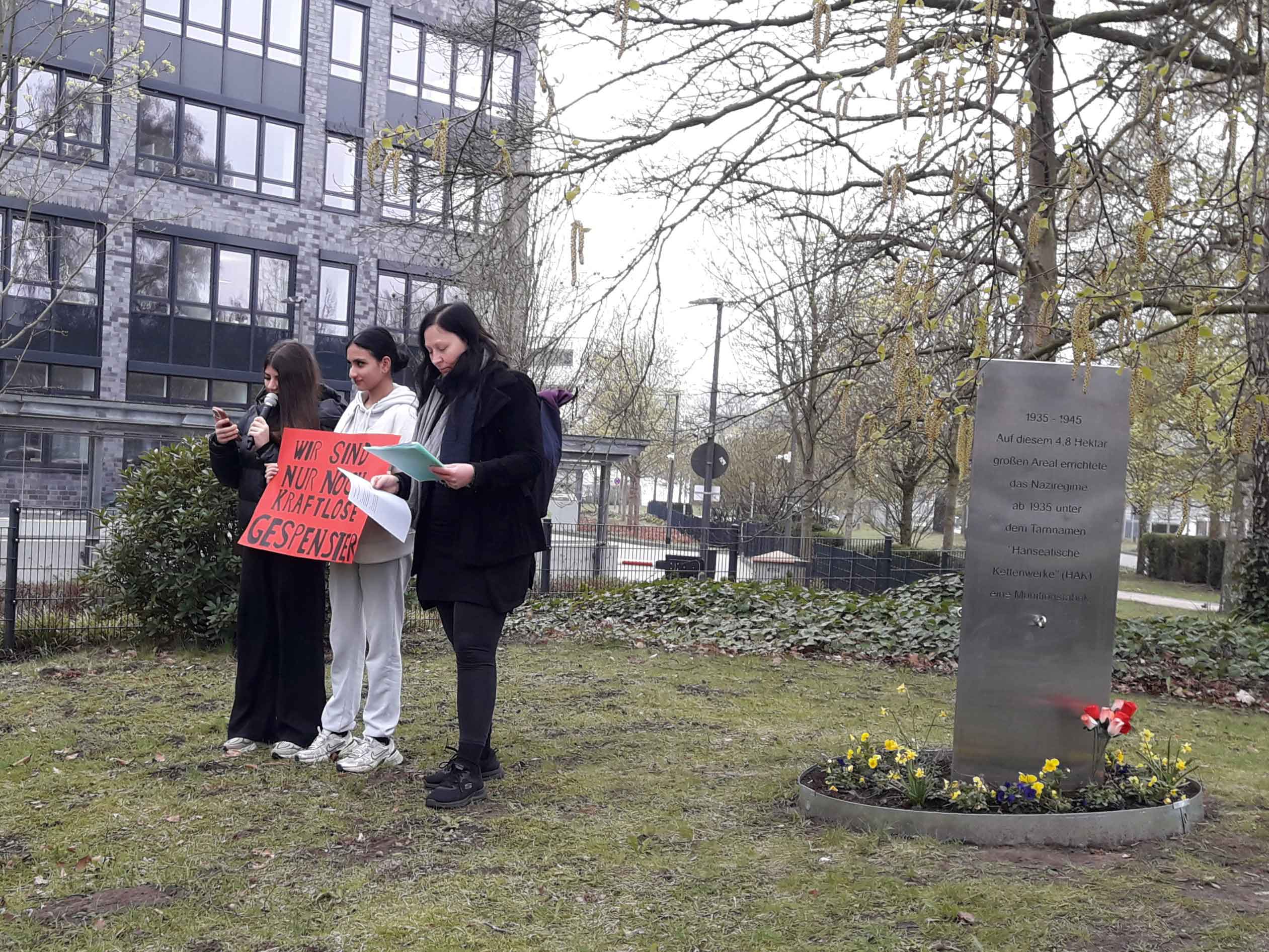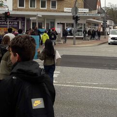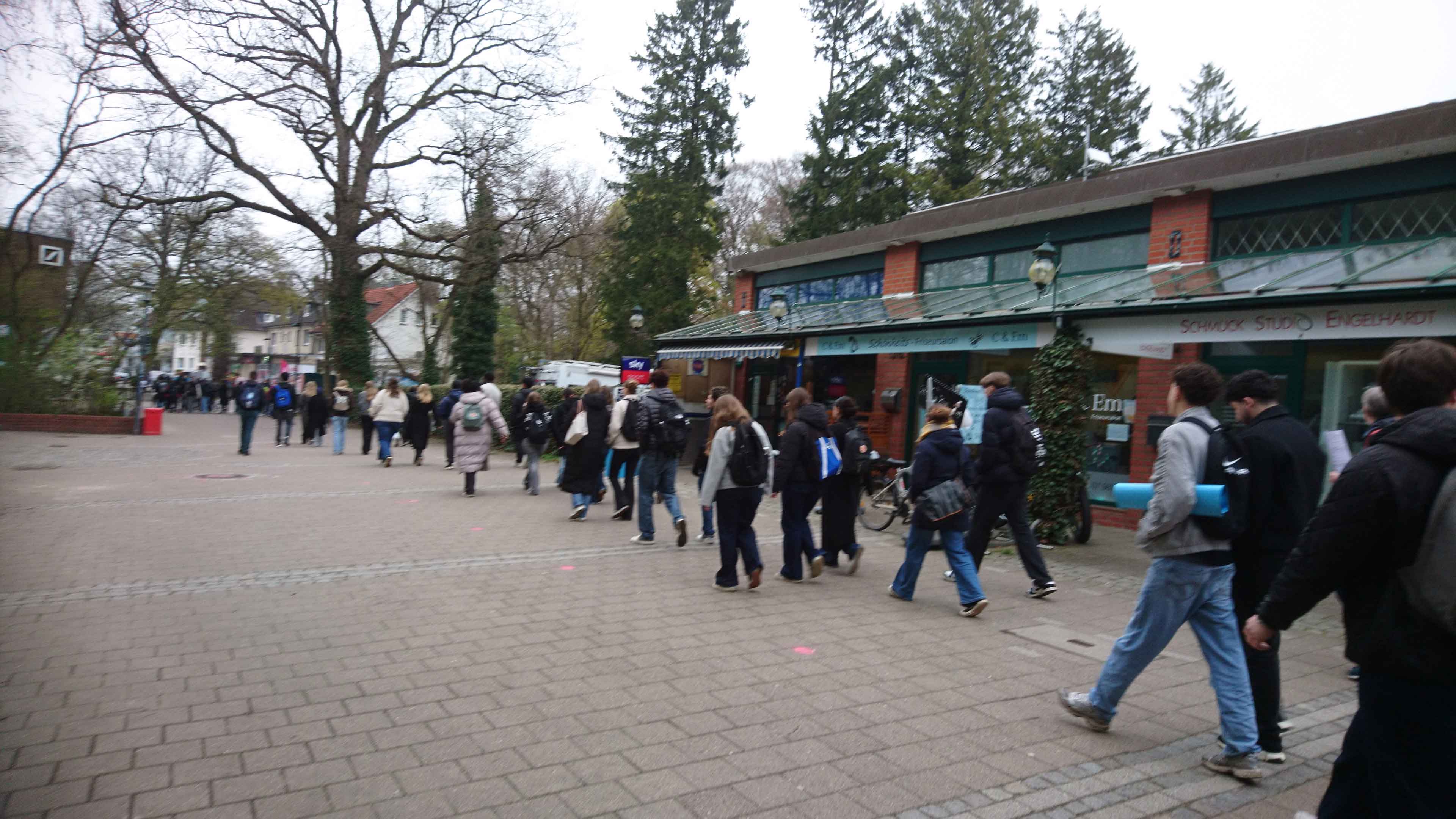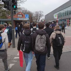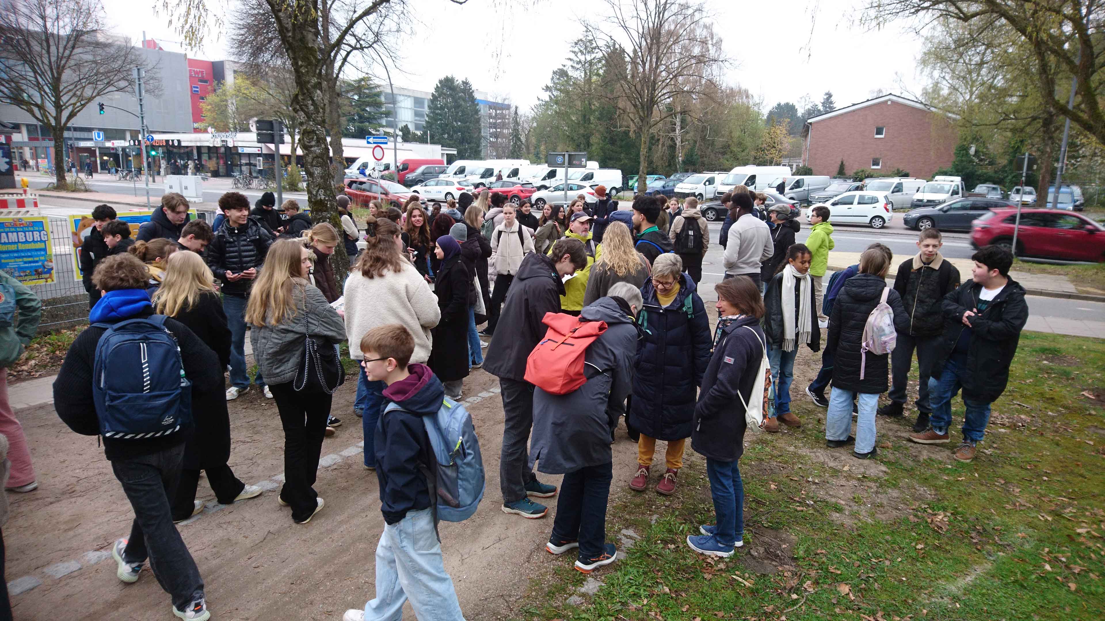 In der Vorbereitungszeit wurden Plakate mit bewegenden Zitaten der beiden Persönlichkeiten Hilde Sherman und Wübbo Sielmann von der Gruppe erstellt. Mit eindrücklichen Wortbeiträgen zu den Umständen des Todesmarsches, zu den persönlichen Schicksalen der beiden sowie zur Wichtigkeit des Gedenkens dieser grausamen Taten in der NS-Zeit heute und in Zukunft wurde die Veranstaltung an der Gedenkstele am U-Bahnhof Ochsenzoll eröffnet. Etwa 60 Schüler:innen des Heidberg aus den Jahrgängen 7-11 nahmen daran teil und brachen danach mit den weiteren Teilnehmenden auf, um einen Teil des damaligen Weges zu Fuß bis Norderstedt zu gehen. Dort wurden wir von einer Schüler:innengruppe des BBZ Norderstedt und dessen Schulleiterin empfangen und haben weitere beeindruckende Redebeiträge zum Todesmarsch gehört. Zu einigen Schicksalen der Menschen, die damals mitlaufen mussten, hat die Geschichts- und Zukunftswerkstatt Langenhorn eine Ausstellung vorbereitet: 16 Plakate, die einige Biographien näher beleuchten und die Umstände des Todesmarschs erklären, hängen ab Mittwoch, 15.4., für zwei Wochen im Flur des Haus C (1. OG) und können dort angeschaut werden. (Ausnahme ist der 21.4.) Wir bedanken uns herzlich für die Zusammenarbeit mit Kim Kielau und der Geschichts- und Zukunftswerkstatt Langenhorn sowie die Unterstützung von Frau Seyler.