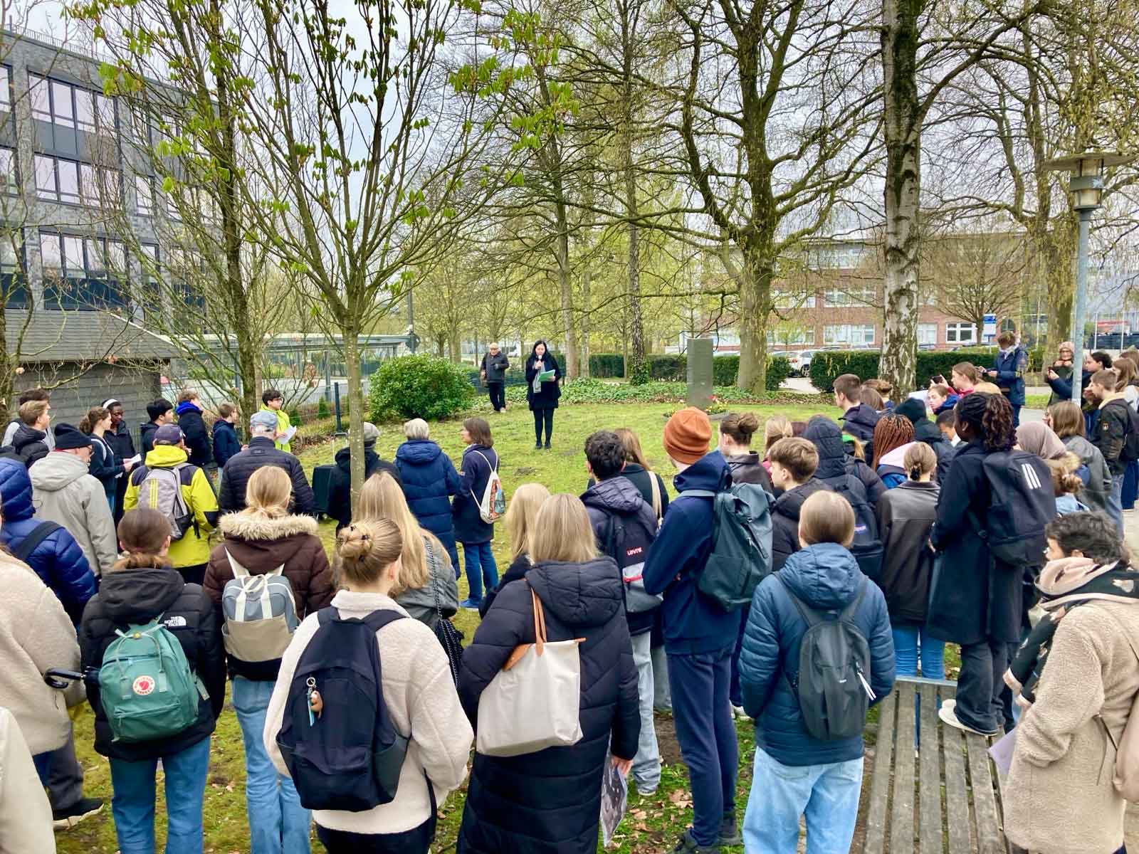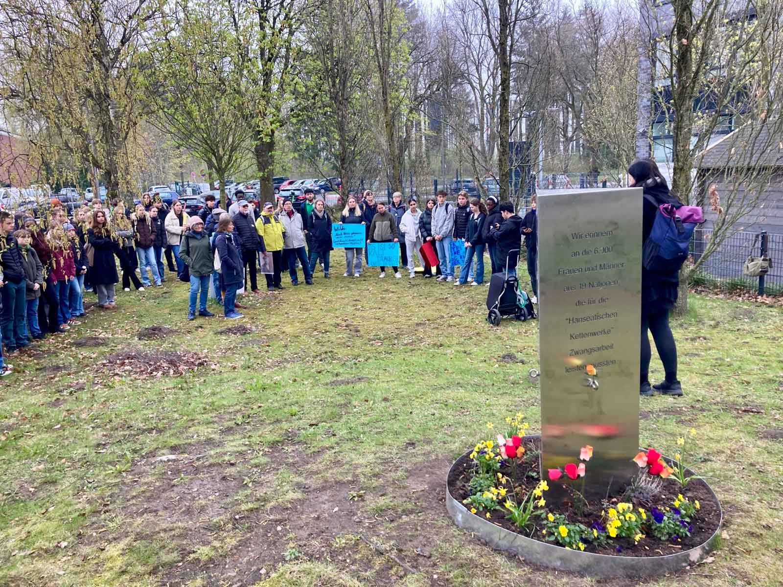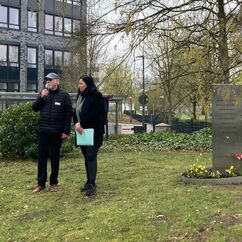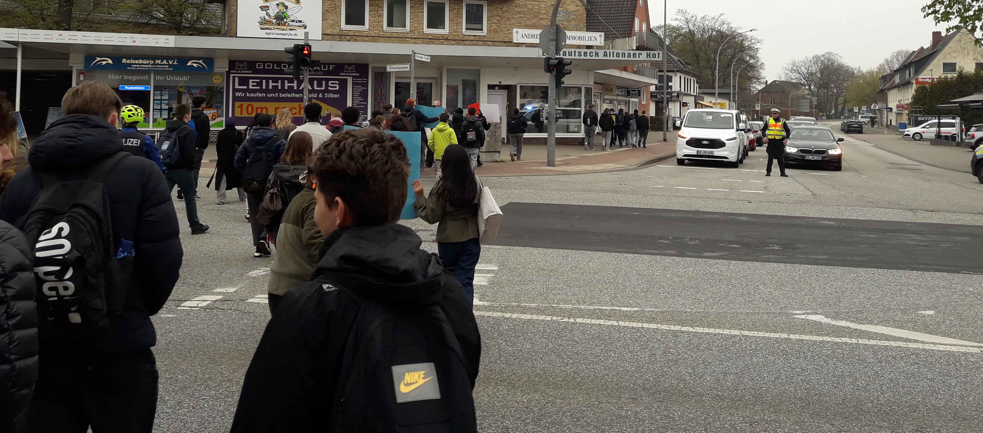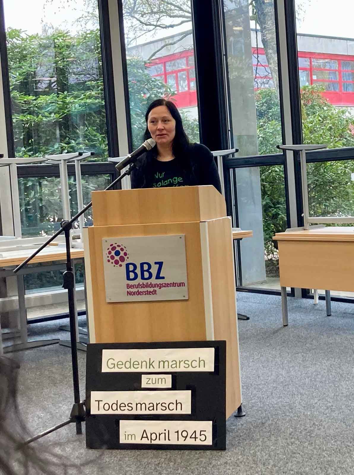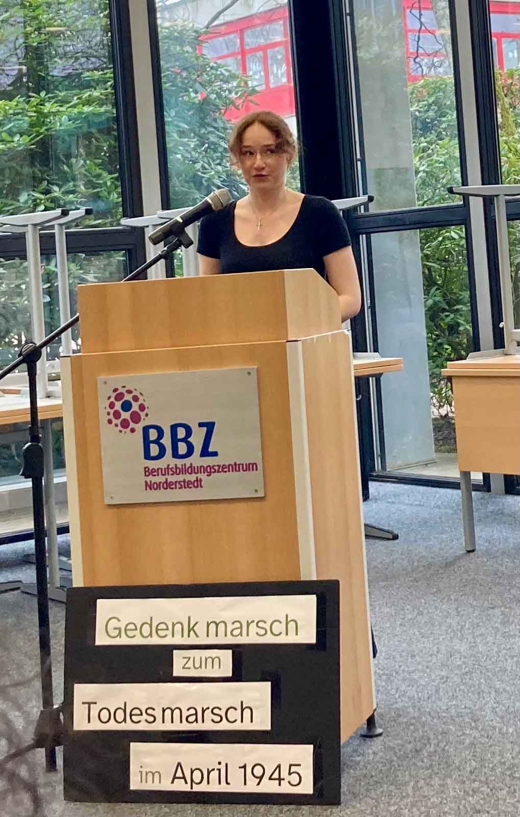 In der Vorbereitungszeit wurden Plakate mit bewegenden Zitaten der beiden Persönlichkeiten Hilde Sherman und Wübbo Sielmann von der Gruppe erstellt. Mit eindrücklichen Wortbeiträgen zu den Umständen des Todesmarsches, zu den persönlichen Schicksalen der beiden sowie zur Wichtigkeit des Gedenkens dieser grausamen Taten in der NS-Zeit heute und in Zukunft wurde die Veranstaltung an der Gedenkstele am U-Bahnhof Ochsenzoll eröffnet. Etwa 60 Schüler:innen des Heidberg aus den Jahrgängen 7-11 nahmen daran teil und brachen danach mit den weiteren Teilnehmenden auf, um einen Teil des damaligen Weges zu Fuß bis Norderstedt zu gehen. Dort wurden wir von einer Schüler:innengruppe des BBZ Norderstedt und dessen Schulleiterin empfangen und haben weitere beeindruckende Redebeiträge zum Todesmarsch gehört. Zu einigen Schicksalen der Menschen, die damals mitlaufen mussten, hat die Geschichts- und Zukunftswerkstatt Langenhorn eine Ausstellung vorbereitet: 16 Plakate, die einige Biographien näher beleuchten und die Umstände des Todesmarschs erklären, hängen ab Mittwoch, 15.4., für zwei Wochen im Flur des Haus C (1. OG) und können dort angeschaut werden. (Ausnahme ist der 21.4.) Wir bedanken uns herzlich für die Zusammenarbeit mit Kim Kielau und der Geschichts- und Zukunftswerkstatt Langenhorn sowie die Unterstützung von Frau Seyler.