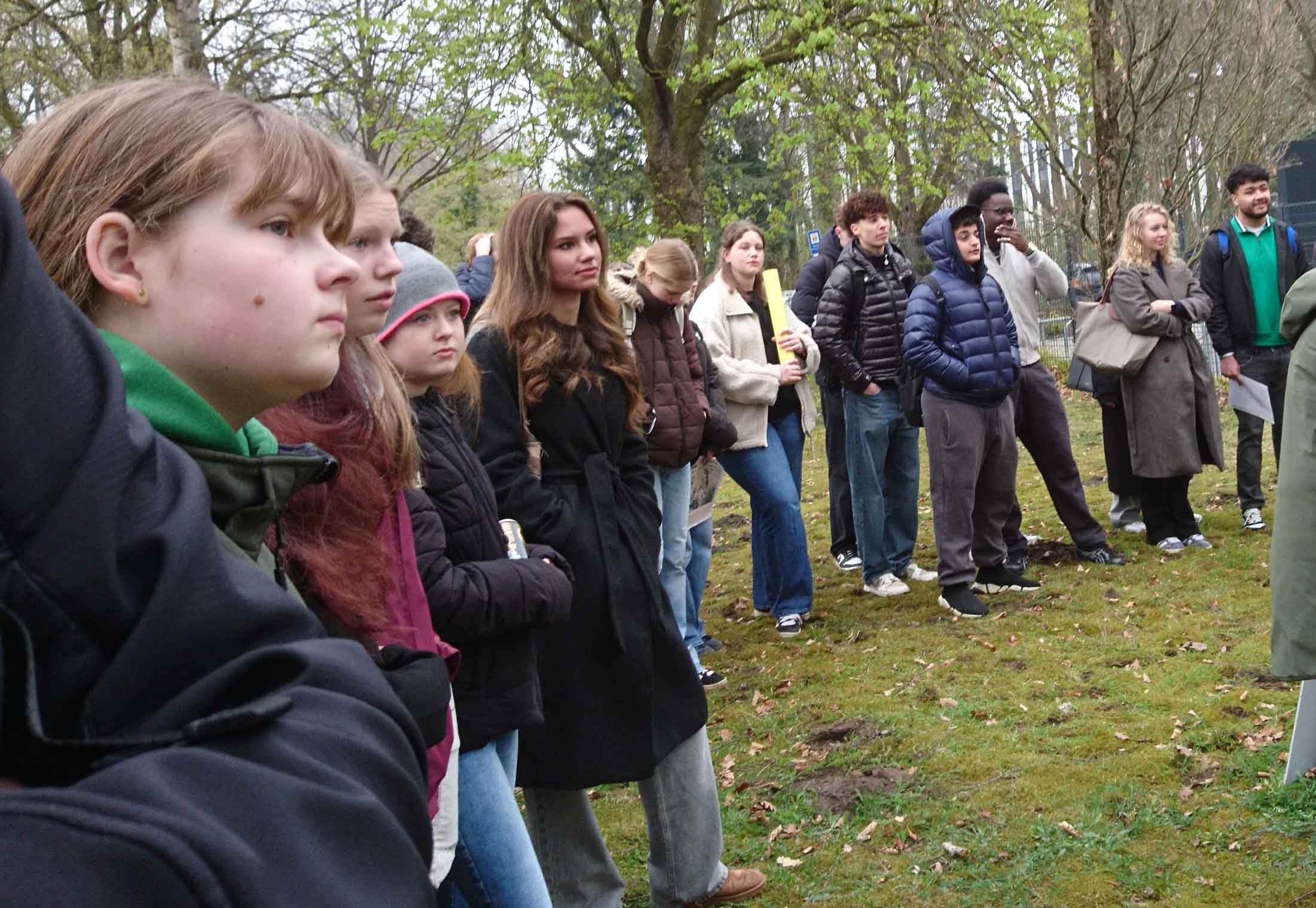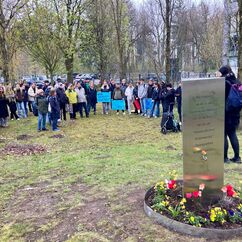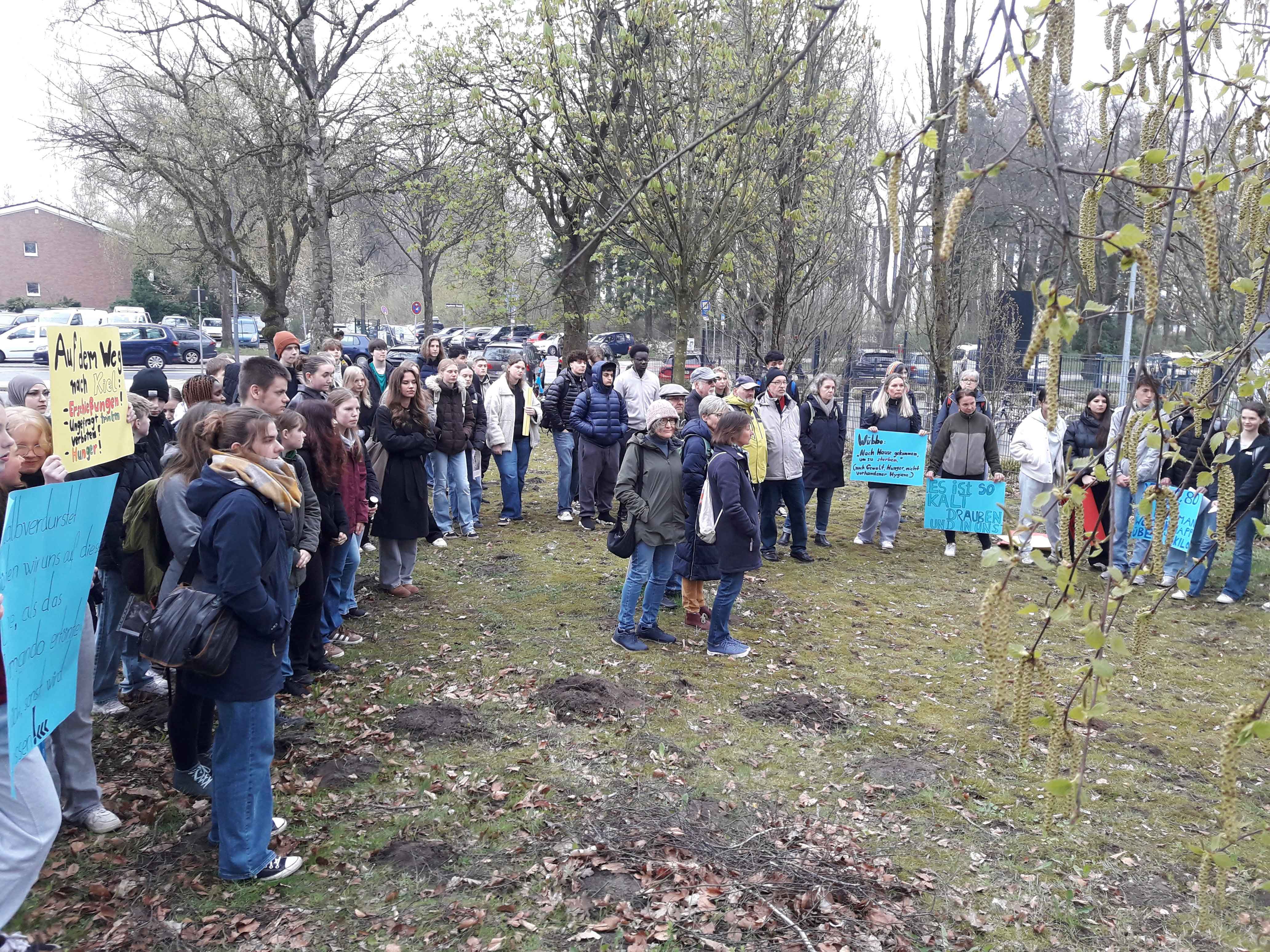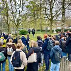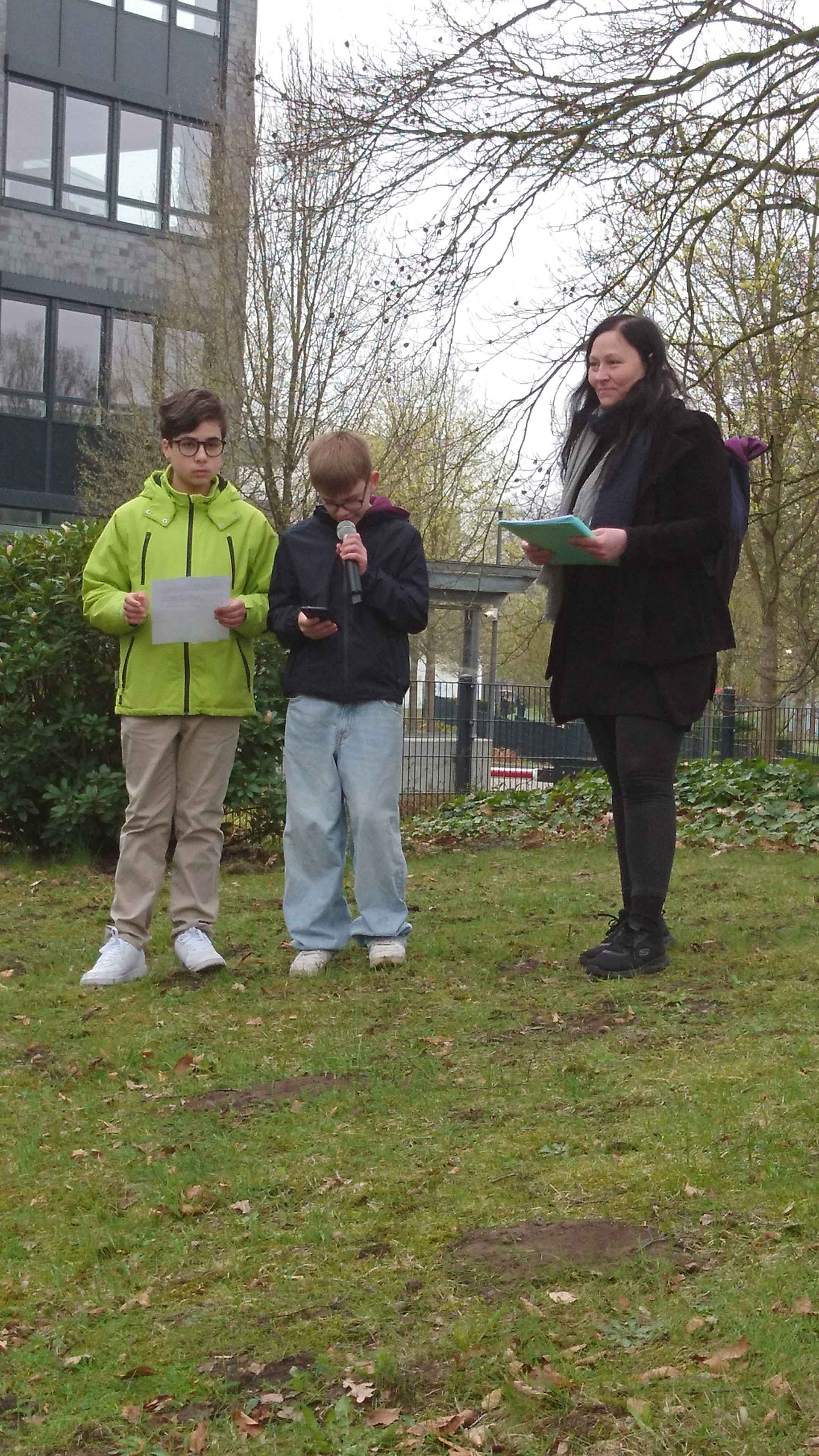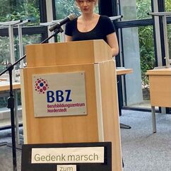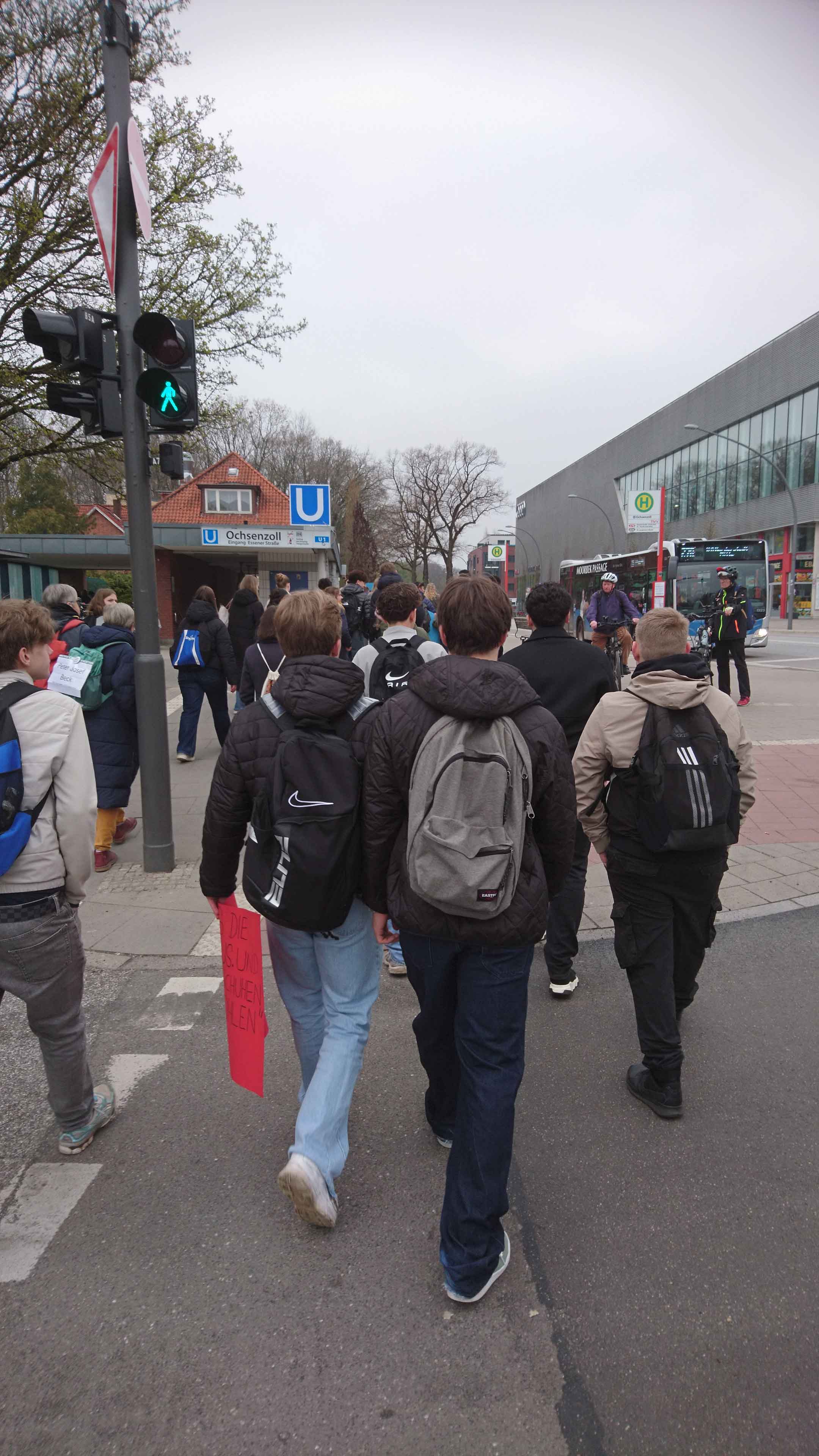 In der Vorbereitungszeit wurden Plakate mit bewegenden Zitaten der beiden Persönlichkeiten Hilde Sherman und Wübbo Sielmann von der Gruppe erstellt. Mit eindrücklichen Wortbeiträgen zu den Umständen des Todesmarsches, zu den persönlichen Schicksalen der beiden sowie zur Wichtigkeit des Gedenkens dieser grausamen Taten in der NS-Zeit heute und in Zukunft wurde die Veranstaltung an der Gedenkstele am U-Bahnhof Ochsenzoll eröffnet. Etwa 60 Schüler:innen des Heidberg aus den Jahrgängen 7-11 nahmen daran teil und brachen danach mit den weiteren Teilnehmenden auf, um einen Teil des damaligen Weges zu Fuß bis Norderstedt zu gehen. Dort wurden wir von einer Schüler:innengruppe des BBZ Norderstedt und dessen Schulleiterin empfangen und haben weitere beeindruckende Redebeiträge zum Todesmarsch gehört. Zu einigen Schicksalen der Menschen, die damals mitlaufen mussten, hat die Geschichts- und Zukunftswerkstatt Langenhorn eine Ausstellung vorbereitet: 16 Plakate, die einige Biographien näher beleuchten und die Umstände des Todesmarschs erklären, hängen ab Mittwoch, 15.4., für zwei Wochen im Flur des Haus C (1. OG) und können dort angeschaut werden. (Ausnahme ist der 21.4.) Wir bedanken uns herzlich für die Zusammenarbeit mit Kim Kielau und der Geschichts- und Zukunftswerkstatt Langenhorn sowie die Unterstützung von Frau Seyler.
