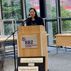Da wir bei dem Projekt DemokratieTalente mitmachen, habe wir die Chance ergriffen, bei diesem Gedenkmarsch mitzugehen. Wir beschäftigen uns mit demokratischen Themen und wollen selbst aktiv werden - wir haben uns deshalb mit 2 Biographien von Personen beschäftigt, die bei dem Todesmarsch dabei waren und ihn überlebten."