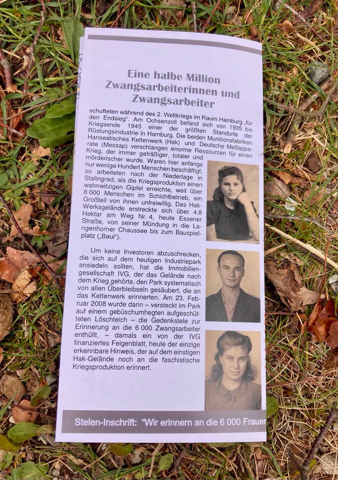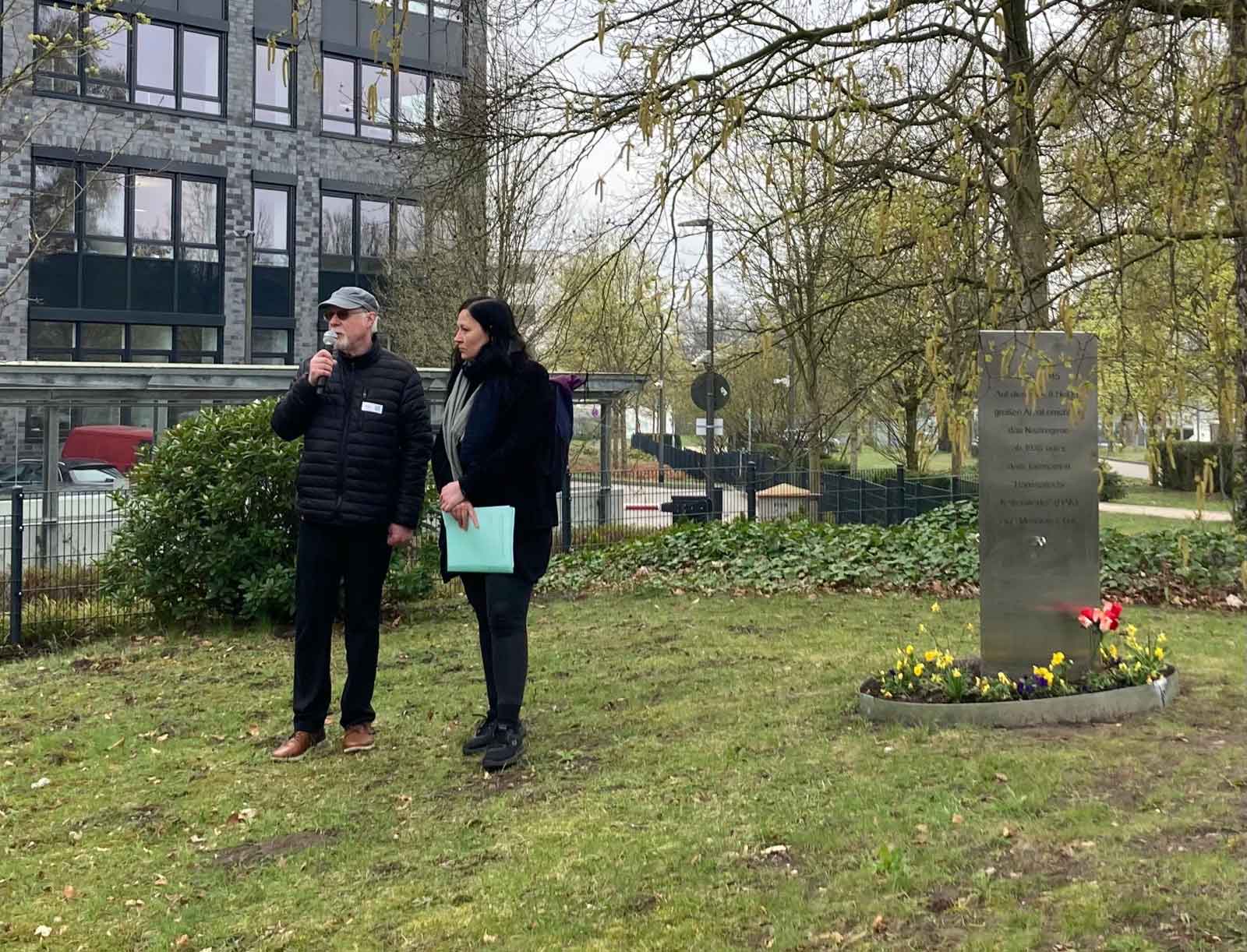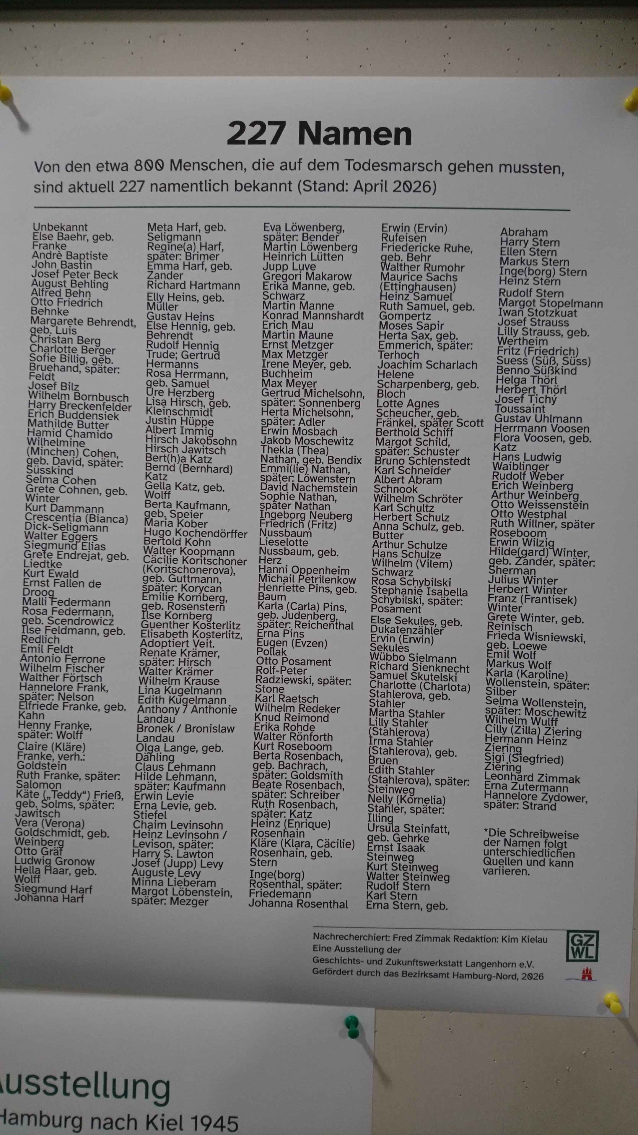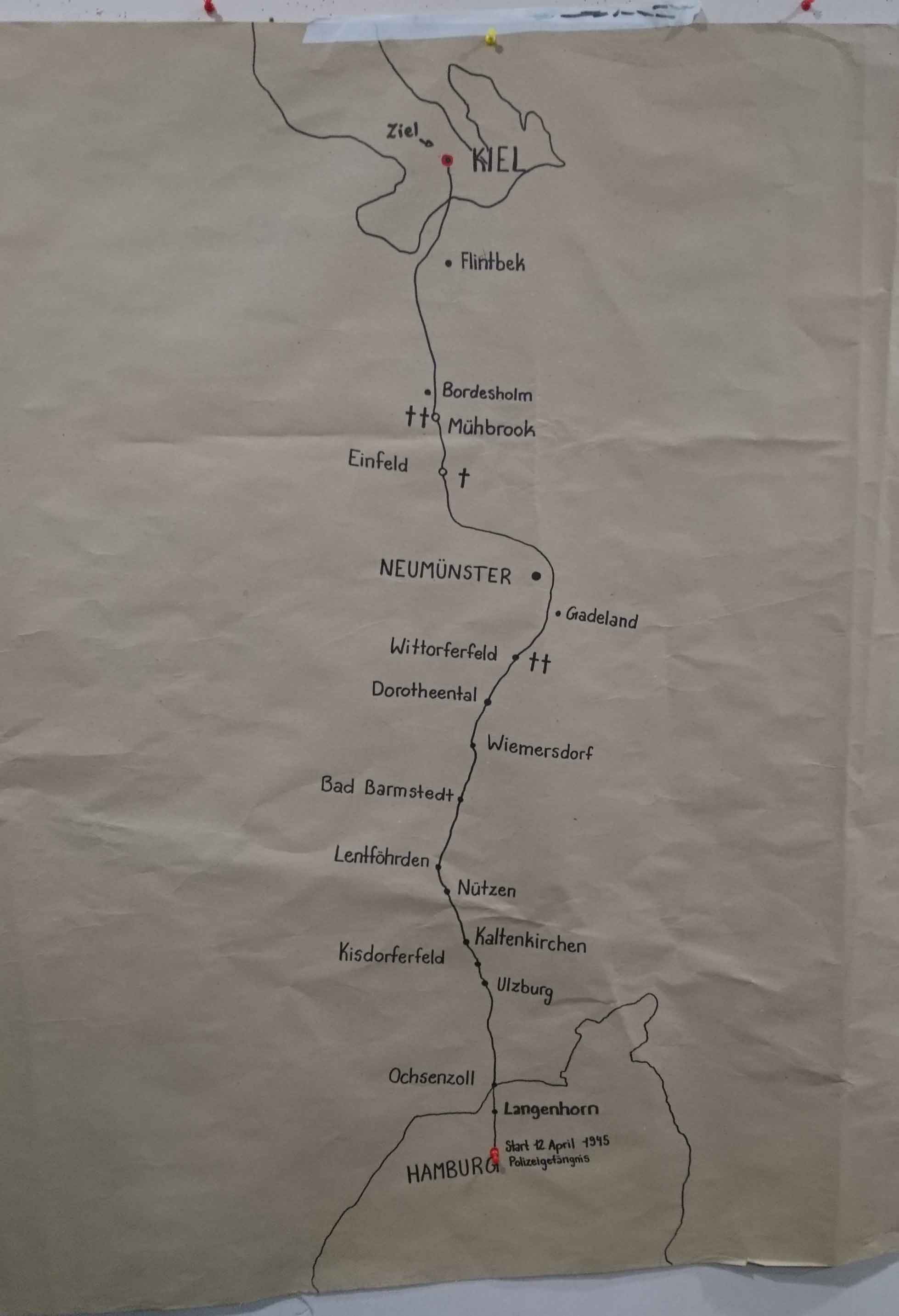 Am 12. April 1945 wurden rund 800 Häftlinge aus dem Polizeigefängnis Fuhlsbüttel auf einen Todesmarsch in Richtung Kiel getrieben. Mindestens neun von ihnen wurden unterwegs erschossen. Ihr Weg führte sie unmittelbar durch unseren Stadtteil, was viele heute gar nicht wissen.