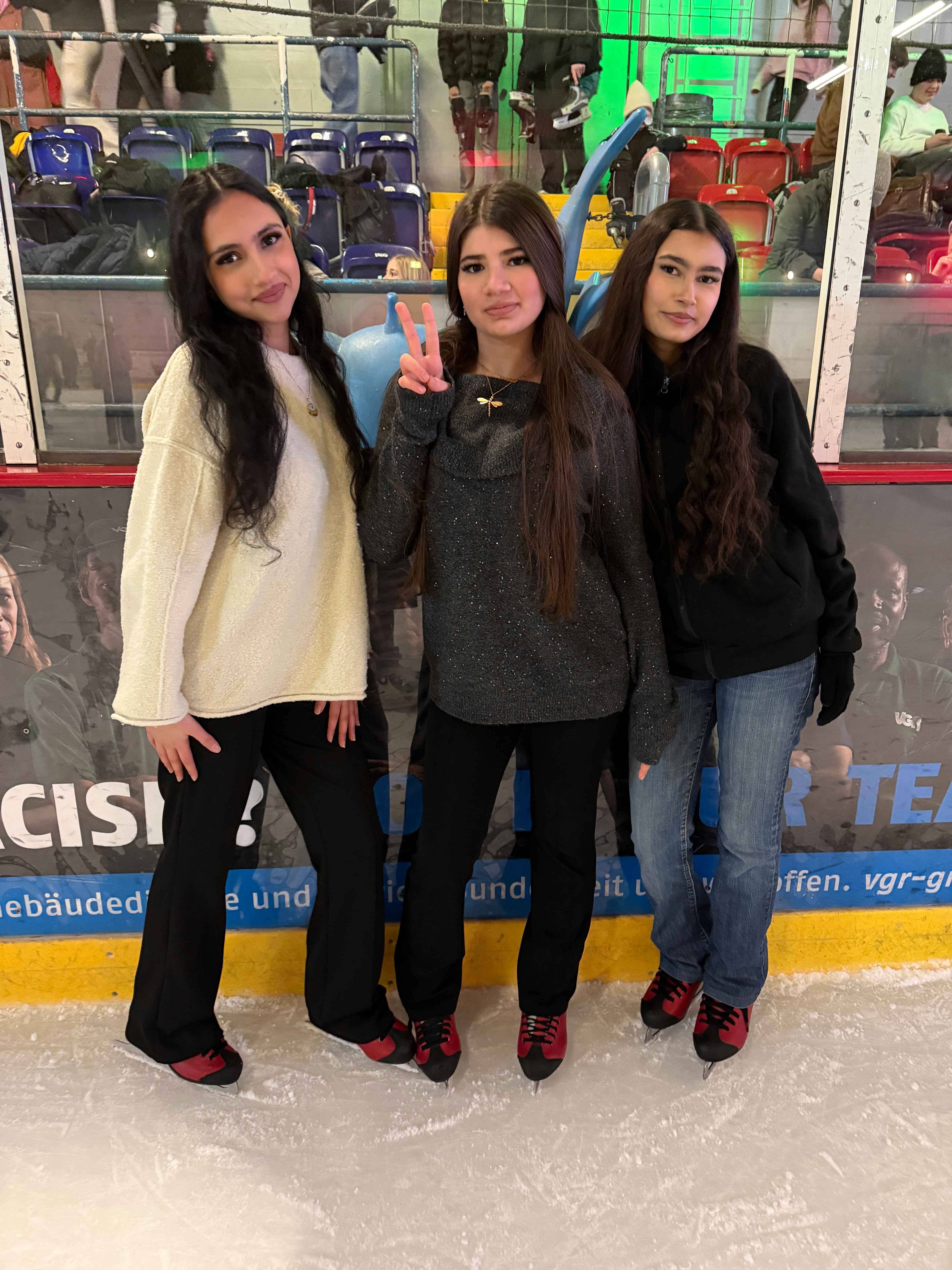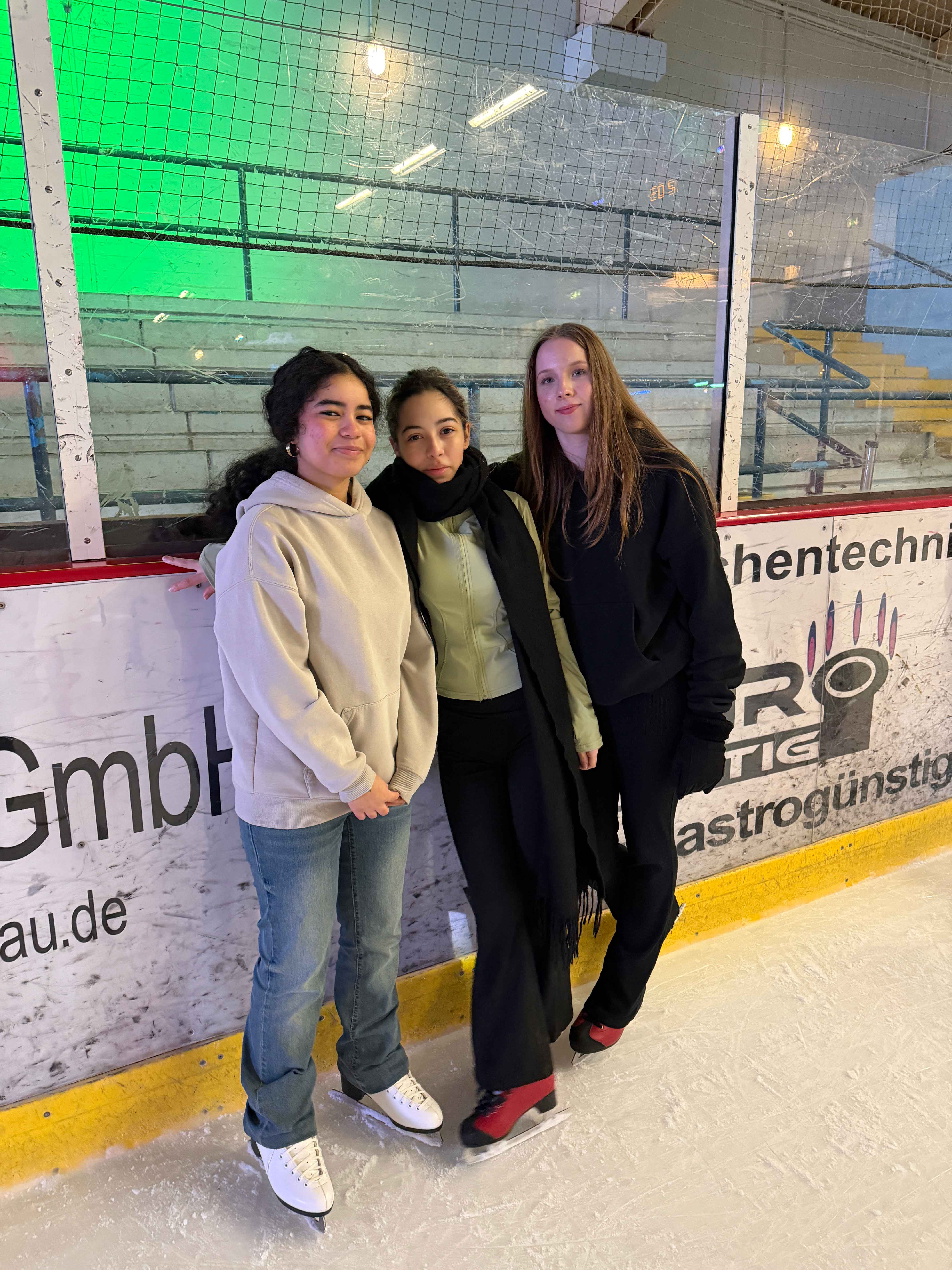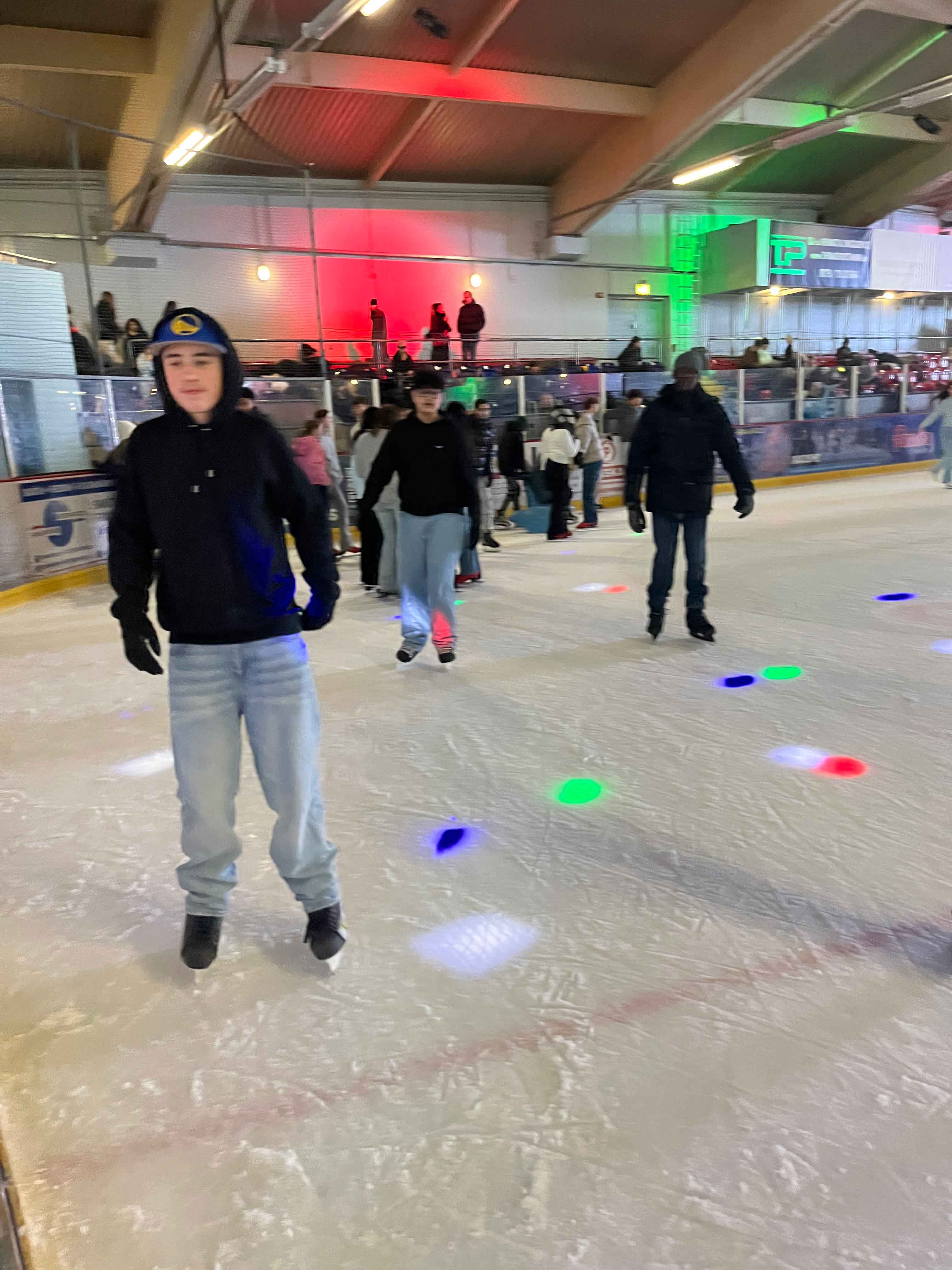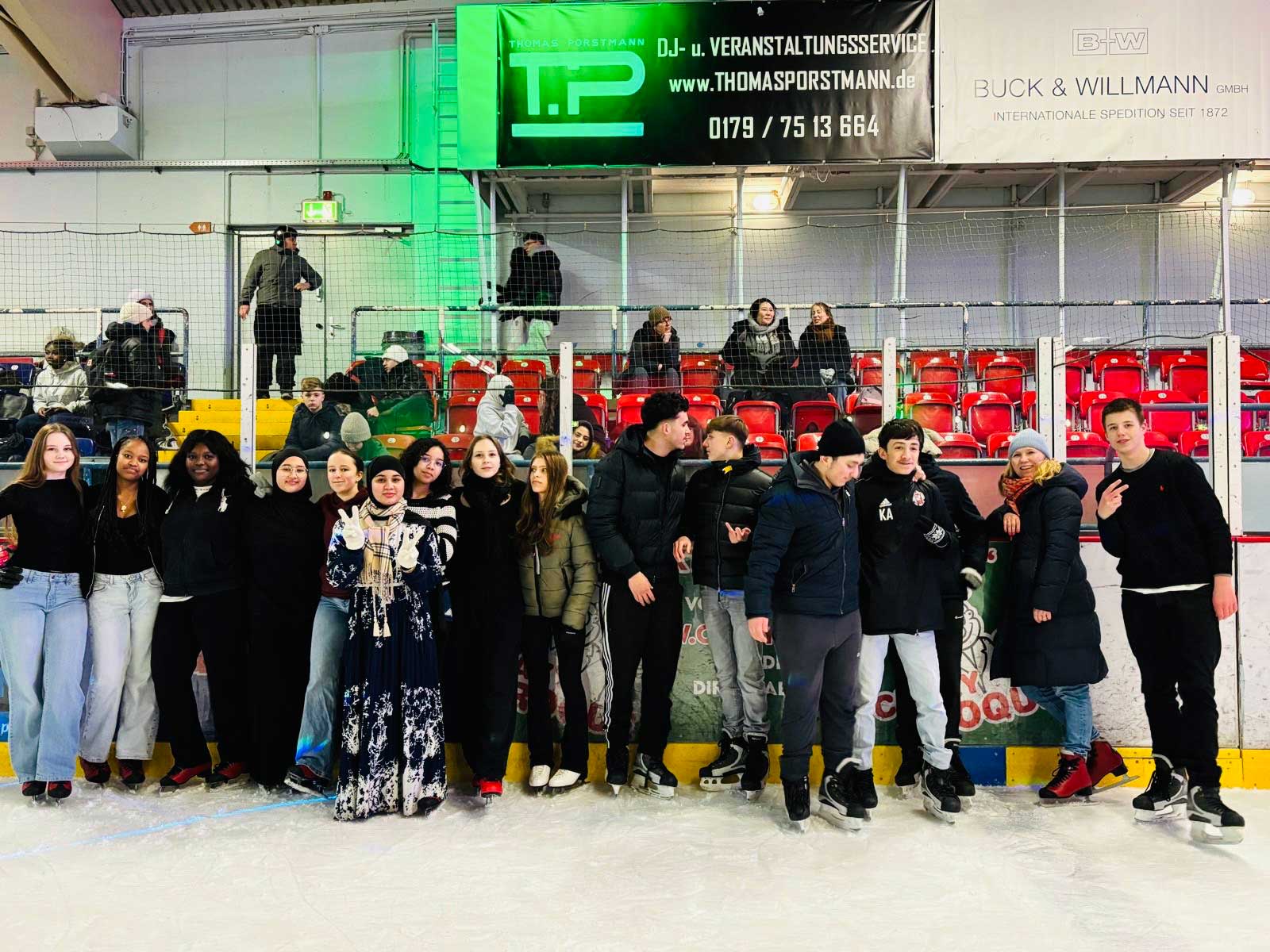 Das war ein rundum gelungener Tag! Nach dem Matheunterricht ging es für den gesamten Jahrgang 9 ab auf die Eisbahn. Wir machen das jedes Jahr seit Klasse 5. Wieder waren wir im Vorfeld ein wenig skeptisch, ob es nicht zu voll werden würde. Doch auch diesmal zeigte sich, Schlittschuhlaufen in großer Runde macht richtig Spaß! Bei Musik und bunten Lichtern konnten alle sich frei bewegen und mit den Mitschüler:innen und Lehrkräften der Parallelklassen zusammen zu sein. Besonders schön ist zu beobachten, dass diejenigen, die nur einmal im Jahr auf dem Eis stehen, wieder deutliche Fortschritte gemacht haben. Eine tolle Gemeinschaftsaktion!
