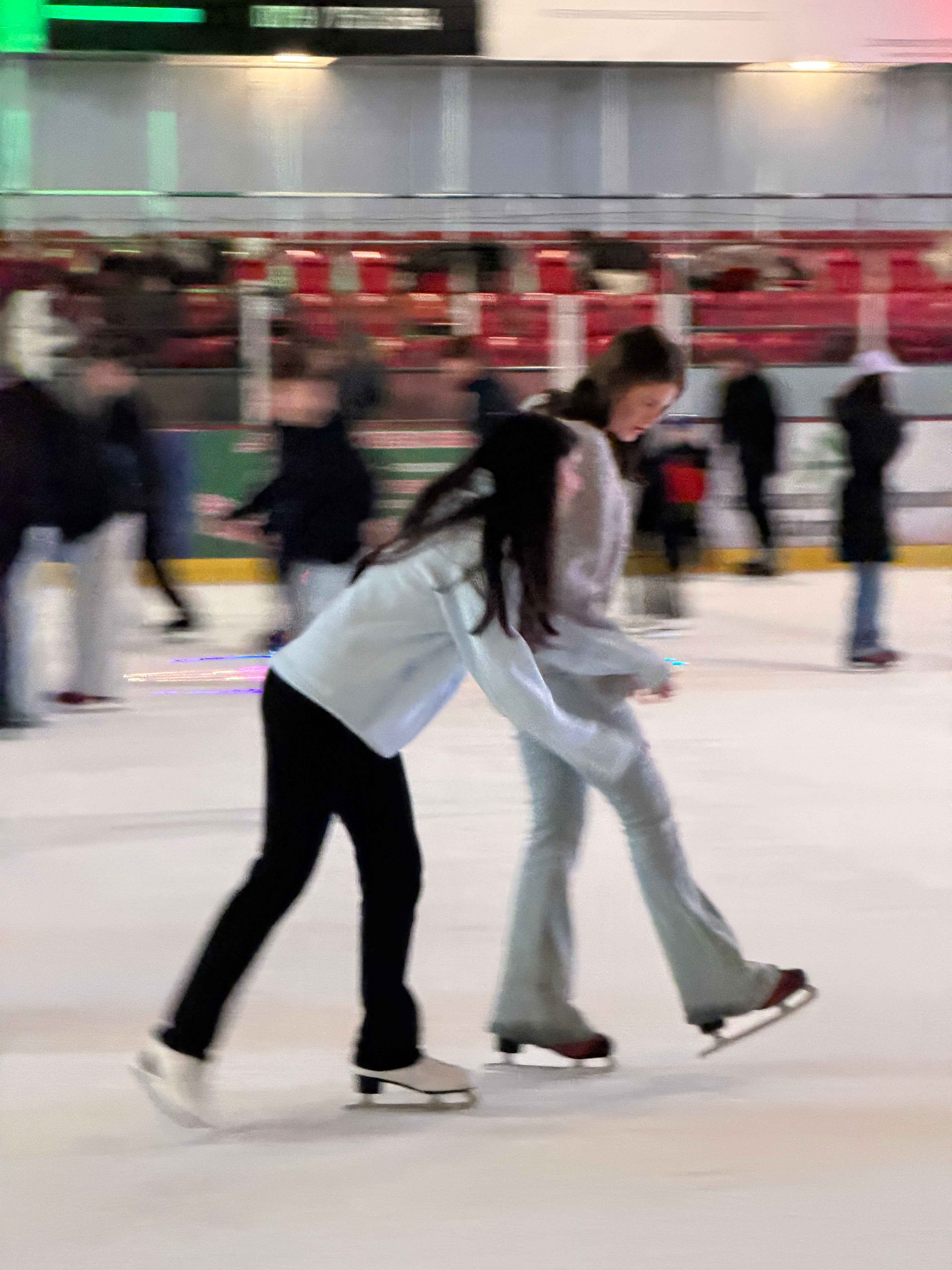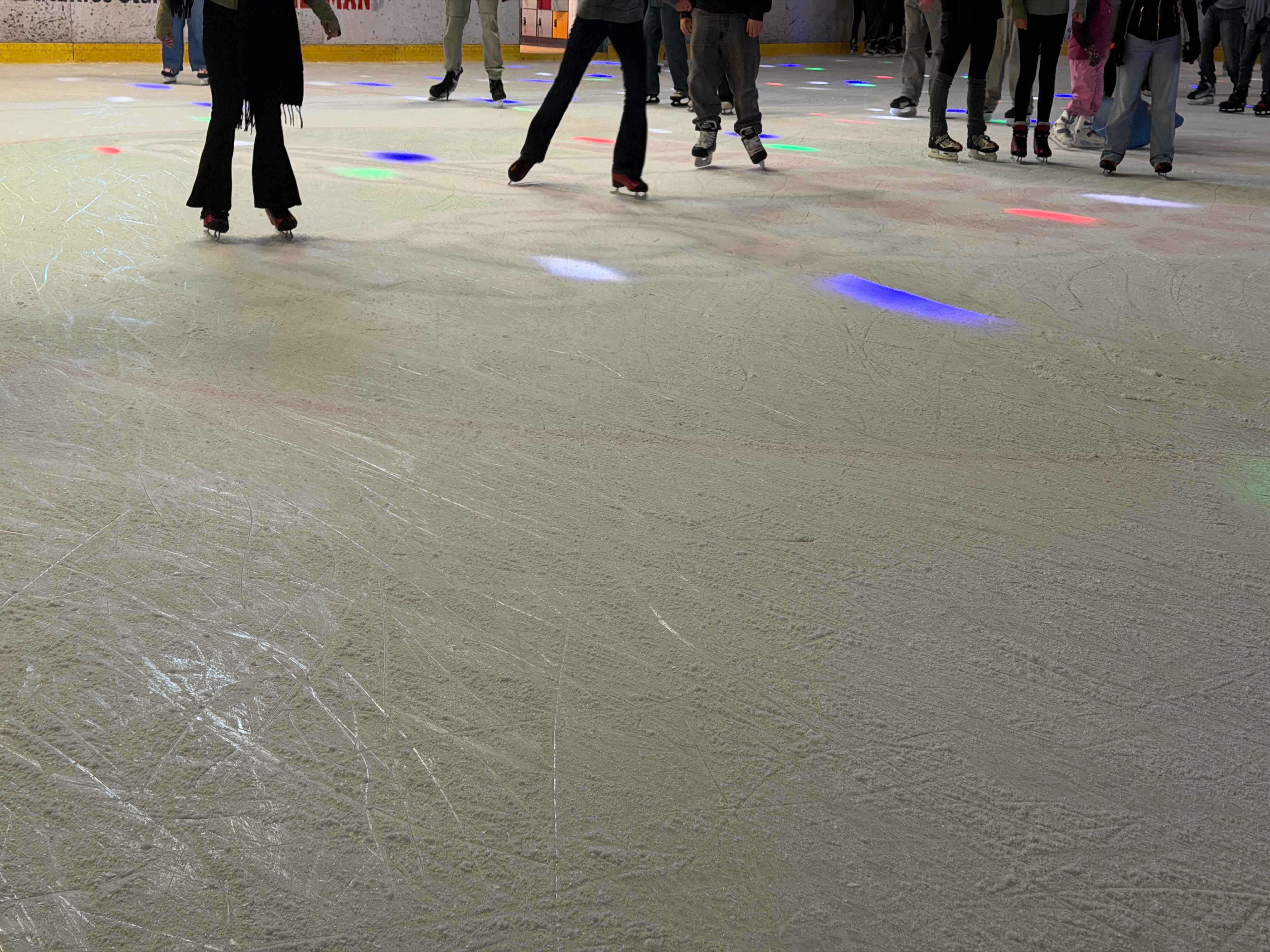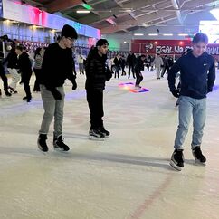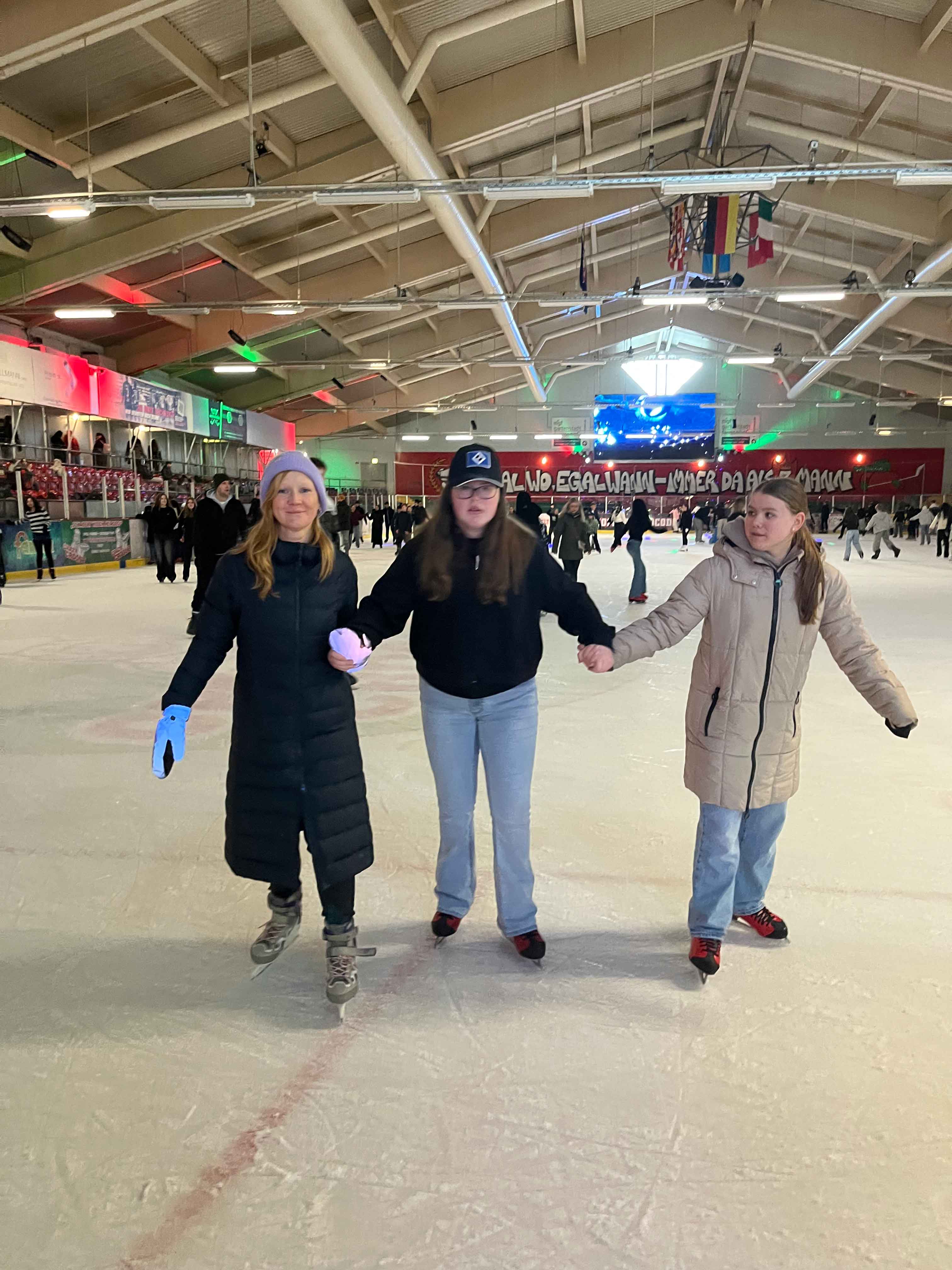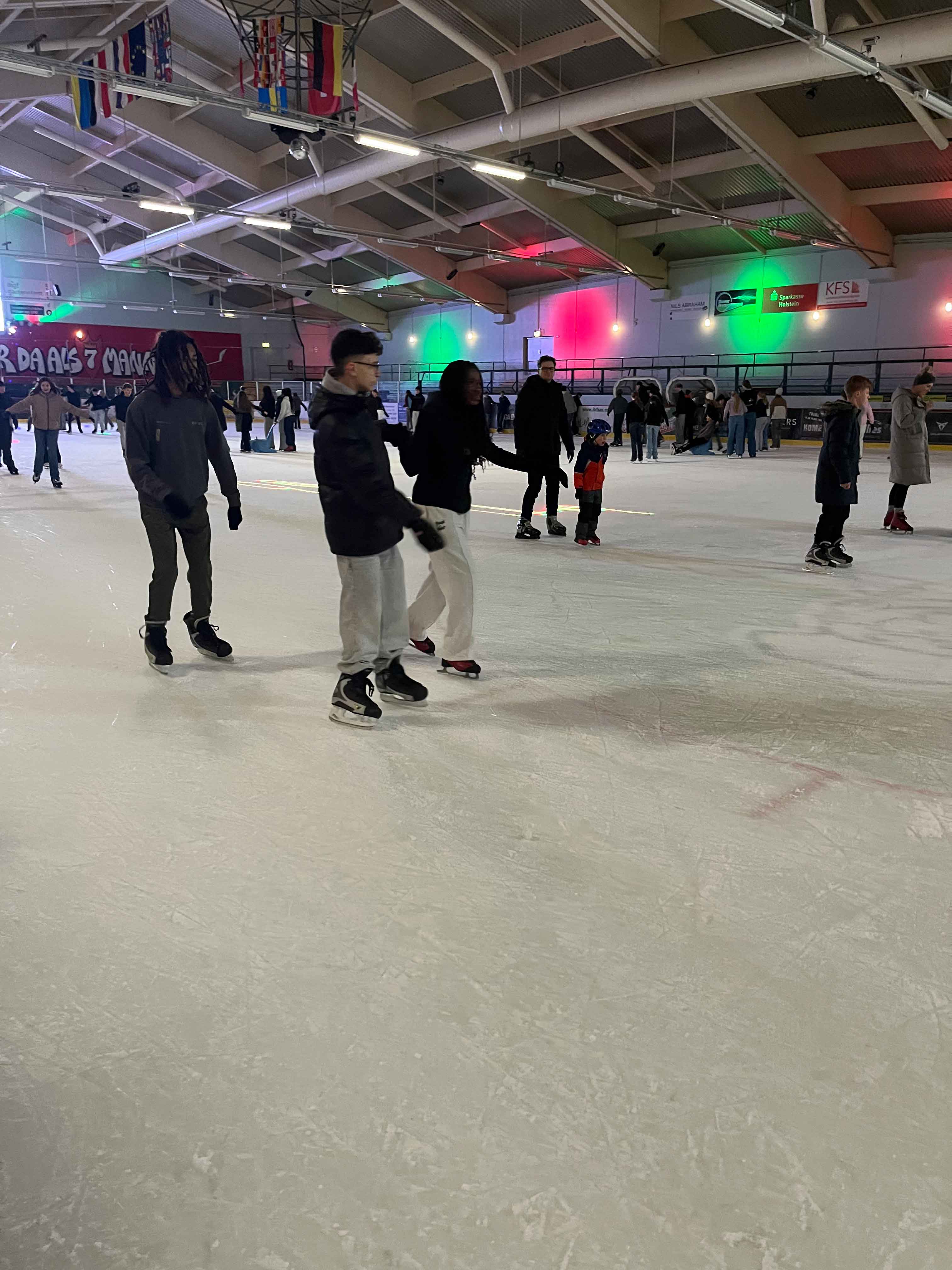 Das war ein rundum gelungener Tag! Nach dem Matheunterricht ging es für den gesamten Jahrgang 9 ab auf die Eisbahn. Wir machen das jedes Jahr seit Klasse 5. Wieder waren wir im Vorfeld ein wenig skeptisch, ob es nicht zu voll werden würde. Doch auch diesmal zeigte sich, Schlittschuhlaufen in großer Runde macht richtig Spaß! Bei Musik und bunten Lichtern konnten alle sich frei bewegen und mit den Mitschüler:innen und Lehrkräften der Parallelklassen zusammen zu sein. Besonders schön ist zu beobachten, dass diejenigen, die nur einmal im Jahr auf dem Eis stehen, wieder deutliche Fortschritte gemacht haben. Eine tolle Gemeinschaftsaktion!